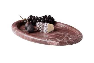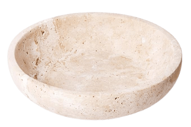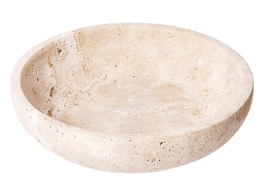A travertine catchall introduces quiet luxury through stone texture and soft edges. It grounds a vignette without overwhelming it.