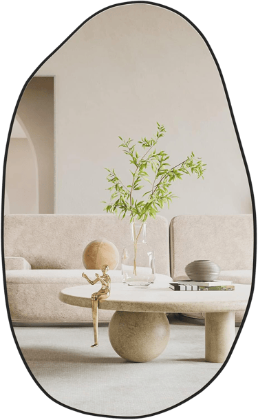 A wavy organic mirror adds reflection, light, and an unexpected shape that keeps a room feeling modern and fresh.