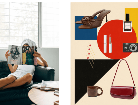 It might be a bag on the back of a chair, a red lip with an otherwise bare face, a stripe on a tea towel, or the stem of a cocktail glass. The rest of the palette can stay calm — creams, browns, blacks, sage — and that one red moment keeps everything from feeling too safe.